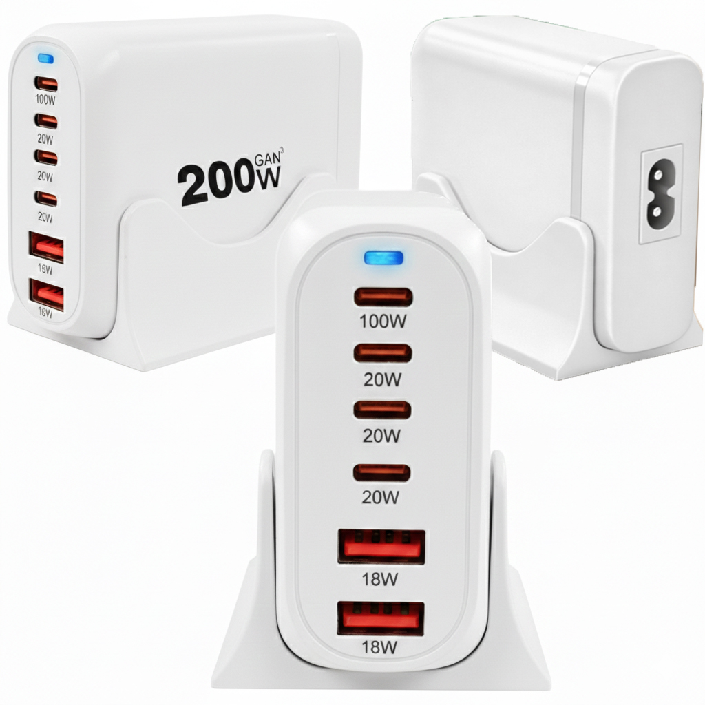 200W mocy • 4x USB-C • 2x USB-A • Power Delivery 100W • Technologia GaN3