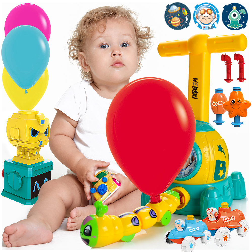 Edukacja poprzez zabawę! Korzystając z nauki, obserwuj razem z dzieckiem, jak samochód lub gąsienica rozpędza się po podłodze używając napompowanego balonu za pomocą stacji pompującej lub gwiazdki, która leci w górę!